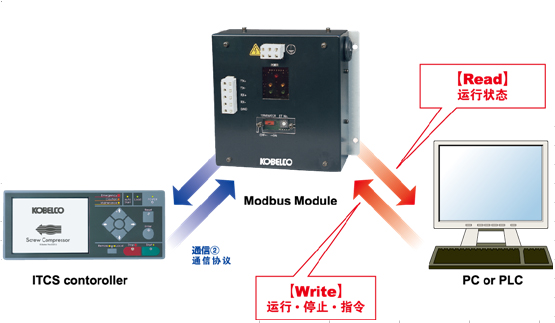 Modbus Module是指通過Modbus協議(通訊順序)收集(讀取)空壓機的壓力、溫度、電流等運行數據,以及實現運行、停止、加載等遠程操作(輸入)。 通信程序來實現壓縮機的壓力,溫度,電流等數據的收集(讀出),以及對壓縮機的運行停止,負荷進行遠隔操作(存入)。因為可以從辦公室實時監控壓縮機的運行狀況,所以能夠方便進行運行管理,并能及時對應故障。